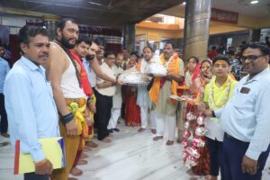 उज्जैन 19 जुलाई 2024 | श्री महाकालेश्वर मंदिर में उत्तरप्रदेश के देवरिया से पधारे श्री बंशीधर तिवारी एवं विवेकनाथ तिवारी द्वारा श्री महाकालेश्वर मंदिर के पुरोहित प्रतिनिधि श्री नवनीत शर्मा व श्री रूपम शर्मा की प्रेरणा से श्री महाकालेश्वर भगवान को रजत आभूषण अर्पित किये | जिसमे 1 नग मुकुट, 2 नग कुंडल व 1 नग छत्र, 11 मुंडो की माला भगवान श्री महाकालेश्वर जी को अर्पित किया गया। जिसका कुल वजन 10828.000 ग्राम है | जिसे श्री महाकालेश्वर मंदिर प्रबन्ध समिति के सहायक प्रशासक श्री मूलचंद जूनवाल द्वारा प्राप्त कर विधिवत रसीद प्रदान की गई व दानदाता का सम्मान किया गया। यह जानकारी श्री महाकालेश्वर मंदिर प्रबंध समिति के कोठारी श्री मनीष पांचाल द्वारा दी गई ।