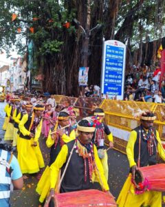 बाबा श्री महाकालेश्वर की दूसरी सवारी में छिंदवाड़ा और डिंडोरी जिले के जनजाति कलाकारों द्वारा मनमोहक नृत्य की प्रस्तुतियां दी गई। छिंदवाड़ा से आए कलाकारों ने पारंपरिक वेशभूषा कुर्ता,धोती और पगड़ी पहनाकर, पिंकी ढोल आदि वाद्ययंत्रों पर भड़म नृत्य की आकषर्क प्रस्तुतियां दीं। वहीं डिंडोरी जिले के जनजातीय कलाकारों ने थिसकी, बासुरी, मादर, टिमकी आदि वाद्य यंत्रों पर कर्मा नृत्य की मनमोहक प्रस्तुतियां ने सवारी में समां बांधा। कर्मा नृत्य में पुरुषों ने हवाल, छीनन्द्री,झंगा ,जैकेट कलगी और महिलाओ ने मुंगी, फरिया, बिरंन माला, करदन, टिसकी पहनी। उल्लेखनीय है कि मुख्यमंत्री डॉ यादव की मंशानुरूप बाबा महाकाल की सवारियों में प्रदेश के विभिन्न जनजातीय जिलों के जनजातीय कलाकारों का समूह शामिल हो रहा हैं।