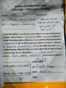 इंदौर दिनांक 21 फरवरी 2025।आयुक्त श्री शिवम वर्मा के निर्देश पर बायपास स्थित होटल गोल्डन लीव्स पर दो लाख की सख्त चालानी कार्यवाही की गई।होटल द्वारा सीवरेज ट्रीटमेंट प्लांट से उपचारित करे बगैर सीवरेज का दूषित जल खुले मैदान में छोड़ा जा रहा था भूमिगत जल प्रदूषित हो रहा था एवं आसपास की कालोनियों के रहवासियों के बोरिंग मै भी दूषित पानी की समस्या उत्पन्न हो रही थी जिसकी स्थिति संज्ञान में आने पर आयुक्त श्री वर्मा द्वारा सख्त कार्यवाही करने के निर्देश दिए गए थे।