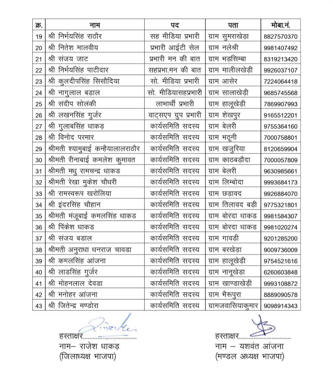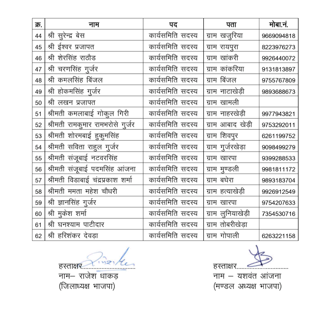 मंडल महामंत्री बने राजेश पाटीदार (इटावा) और रायसिंह परमार (कचनारिया)। मंडल मंत्री पद पर धर्मेन्द्रसिंह गौड़ (भोजुखेड़ी), श्रीमती प्रेमबाई दिनेश चौधरी (कायथा), श्रीमती सीताबाई भगवतसिंह राठौर (उपड़ी), श्रीमती रामुबाई अरुण परमार (काठबड़ौदा) एवं रवि (आनंदखेड़ी) को स्थान मिला।