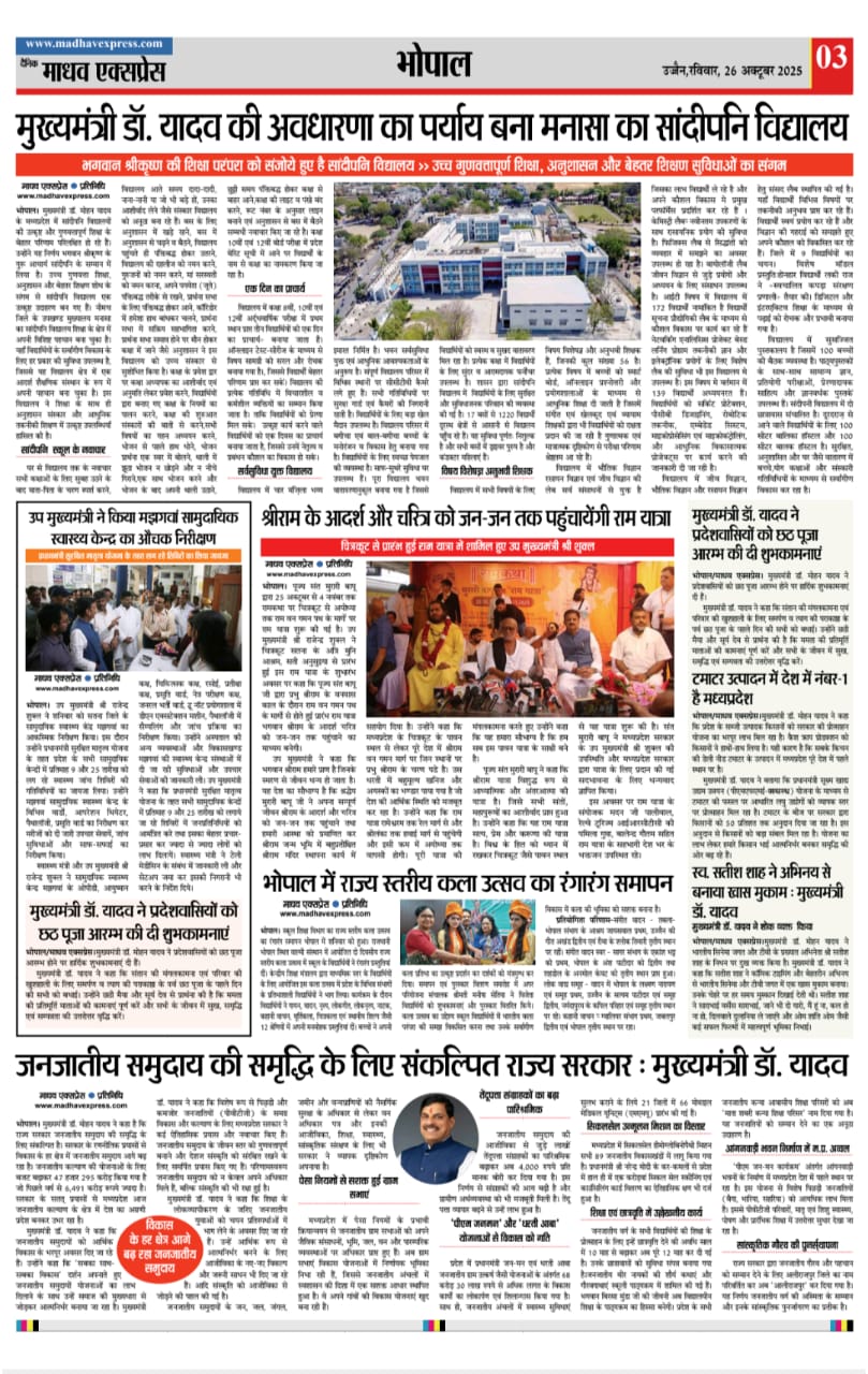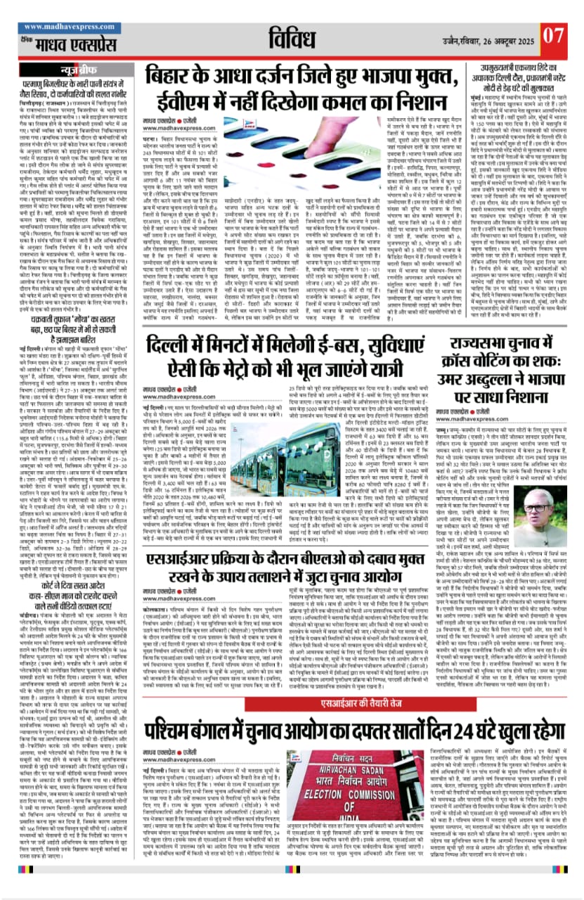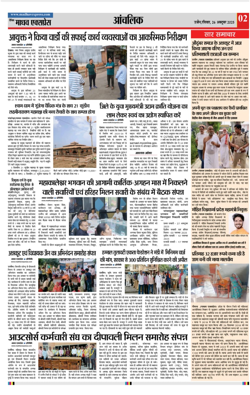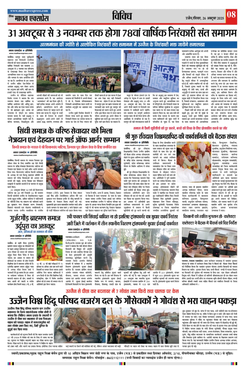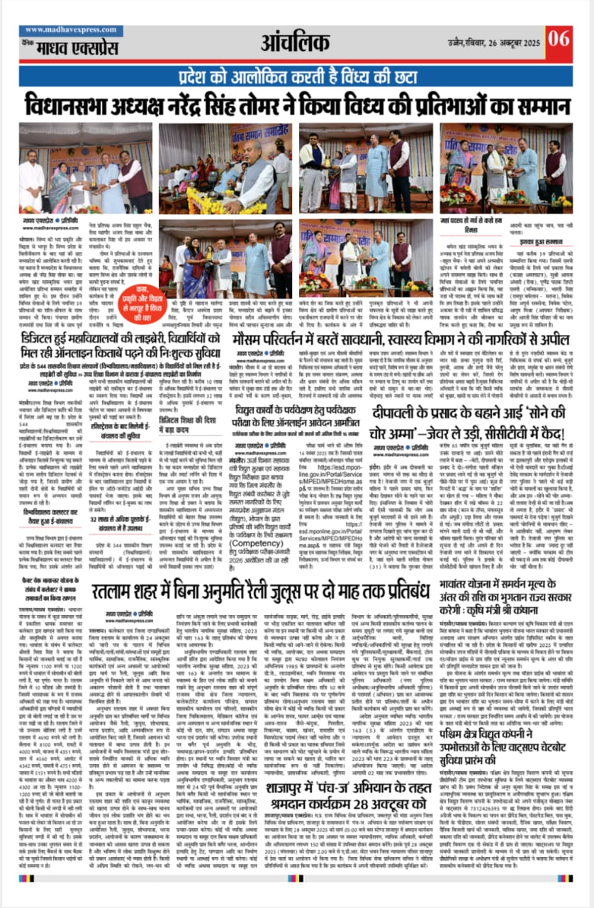 दैनिक माधव एक्सप्रेस आज का अखबार 26/10/2025 रविवार Nitesh Jain October 26, 2025 Spread the love About the Author Nitesh Jain Editor मध्यप्रदेश Visit Website View All Posts Spread the love Post navigation Previous: राजा भोज एयरपोर्ट पर विंटर सीजन शुरू, भोपाल-दिल्ली के बीच आज से नई फ्लाइटNext: सरदार पटेल की 150वीं जयंती पर गरियाबंद में तैयारियों का कलेक्टर ने किया निरीक्षण Leave a Reply Cancel replyYour email address will not be published. Required fields are marked *Comment * Name * Email * Website Save my name, email, and website in this browser for the next time I comment. Related Stories 1 minute read मुख्यमंत्री डॉ. मोहन यादव की नववर्ष सौगात: छोटे दुकानदारों को बड़ी राहत Nitesh Jain January 2, 2026 0 राज्यपाल श्री डेका को मुख्यमंत्री श्री साय ने दी नए वर्ष की शुभकामनाएं देवेंद्र साहू "नादान" माधव न्यूज January 2, 2026 0 1 minute read भारत के विकास का ग्रोथ इंजन बना छत्तीसगढ़ : श्री गजेंद्र सिंह शेखावत देवेंद्र साहू "नादान" माधव न्यूज January 2, 2026 0