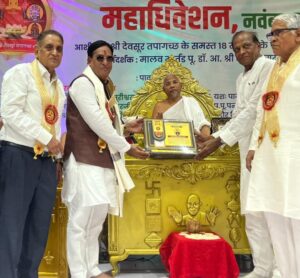 झारड़ा : इंदौर नगर में प पु आचार्य भगवंत विश्व रत्न साग़रसुरी जी महाराज साब की निश्रा में इंदौर नगर में तपागछ श्रीसंघ के प्रदेश स्तरीय अधिवेशन में मालवा महासंघ के राष्ट्रीय अध्यक्ष दिलसुखराज कटारिया एवं कार्यकारी अध्यक्ष संतोष मेहता को तपागछ रत्न की उपाधि से अलंकृत किया गया ।यह सम्मान आप दोनों की समाज के प्रति समर्पण ,जिन शासन के कार्यों को सुंदर रूप से संचालित करने के लिए दिया गया ।इंदौर के देव सुर तपगच्छ पीपलीबाजार के अध्यक्ष एवं कार्यकारणी सदस्यों द्वारा आचार्य भगवंत विश्व रत्न साग़रसुरी जी महाराज साब की प्रेरणा से दिया गया ।मालवा महासंघ के गौरव दिलसुखराज कटारिया एवं संतोष मेहता को मालवा महासंघ के तपा गछ रत्न से सम्मानित होने पर अनिल देसरला ,राजेश मानव ,अभय चोपड़ा ,पारस चोरड़िया एवं पूरे मालवा महासंघ की ओर से शुभकामनाएं प्रेषित की गई ।कार्यकारी अध्यक्ष ने अपने उद्बोधन में बताया कि यह सम्मान हमारा नहीं हे यह सम्मान पूरे मालवा महासंघ का हे ।उक्त जानकारी झारड़ा जैन श्रीसंघ अध्यक्ष पारस चोरड़िया द्वारा दी गई ।
